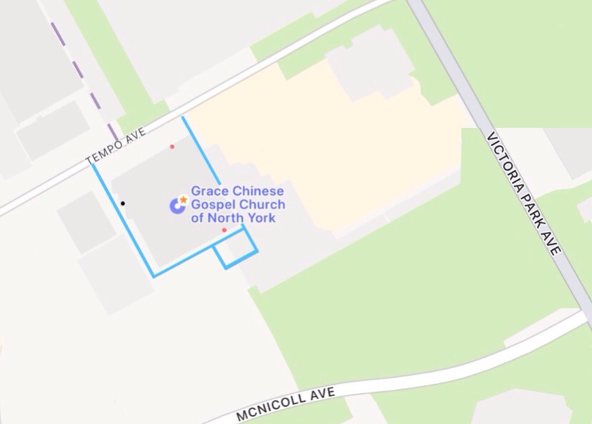◼︎ 泊車位 ◼︎ 泊車位 (只限星期五晚及星期日 – 100 Tempo Ave) ◼︎ 正門入口 ◼︎ 往辦公室入口(辦公室時間及星期日)
